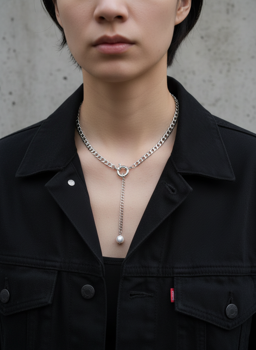 Ett halsband i rostfritt stål där du själv bestämmer uttrycket. Bär det som en clean kedja för en minimalistisk look, eller addera kedjan med den stora sötvattenspärlan för ett mjukare och mer uttrycksfullt statement.