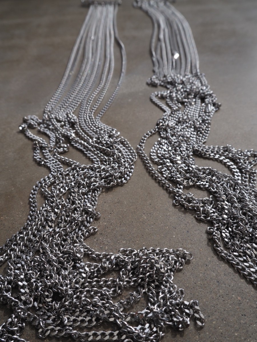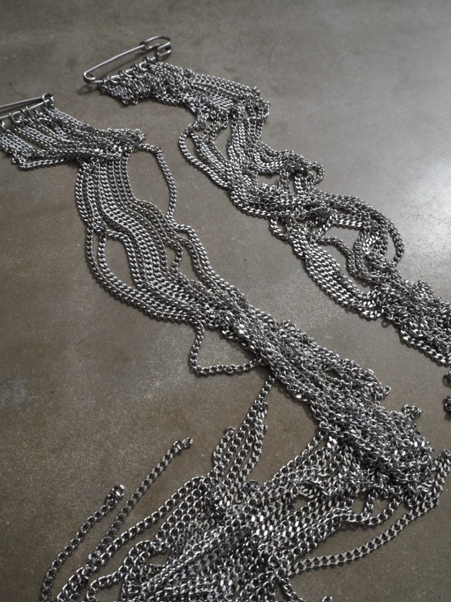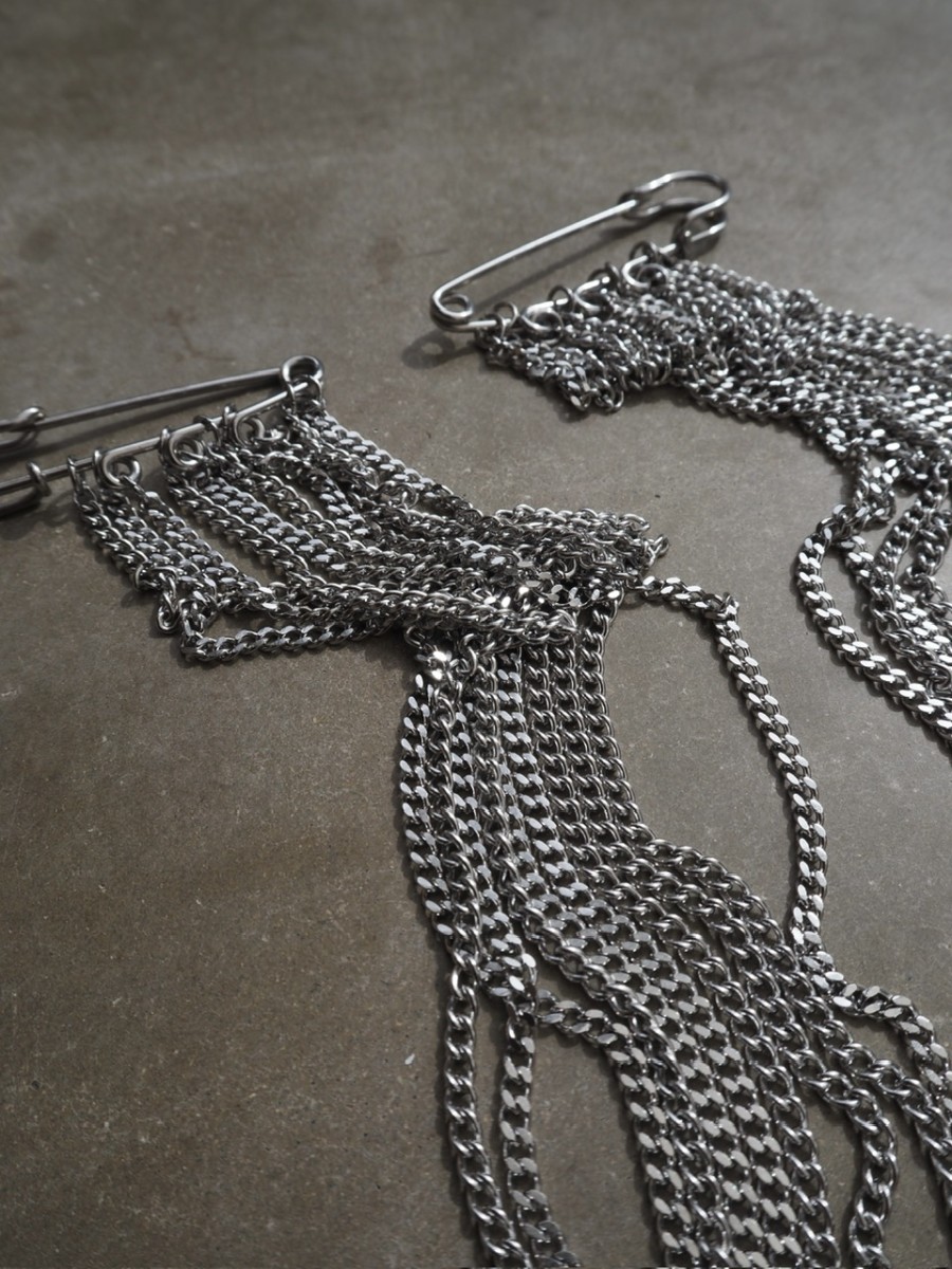 Två säkerhetsnålar i metall möter 10 meter kedjor i rostfritt stål som faller, draperas och förändras beroende på hur du bär dem. Fäst dem i en kavaj, jacka eller vilket plagg du vill och låt smycket bli en del av silhuetten.