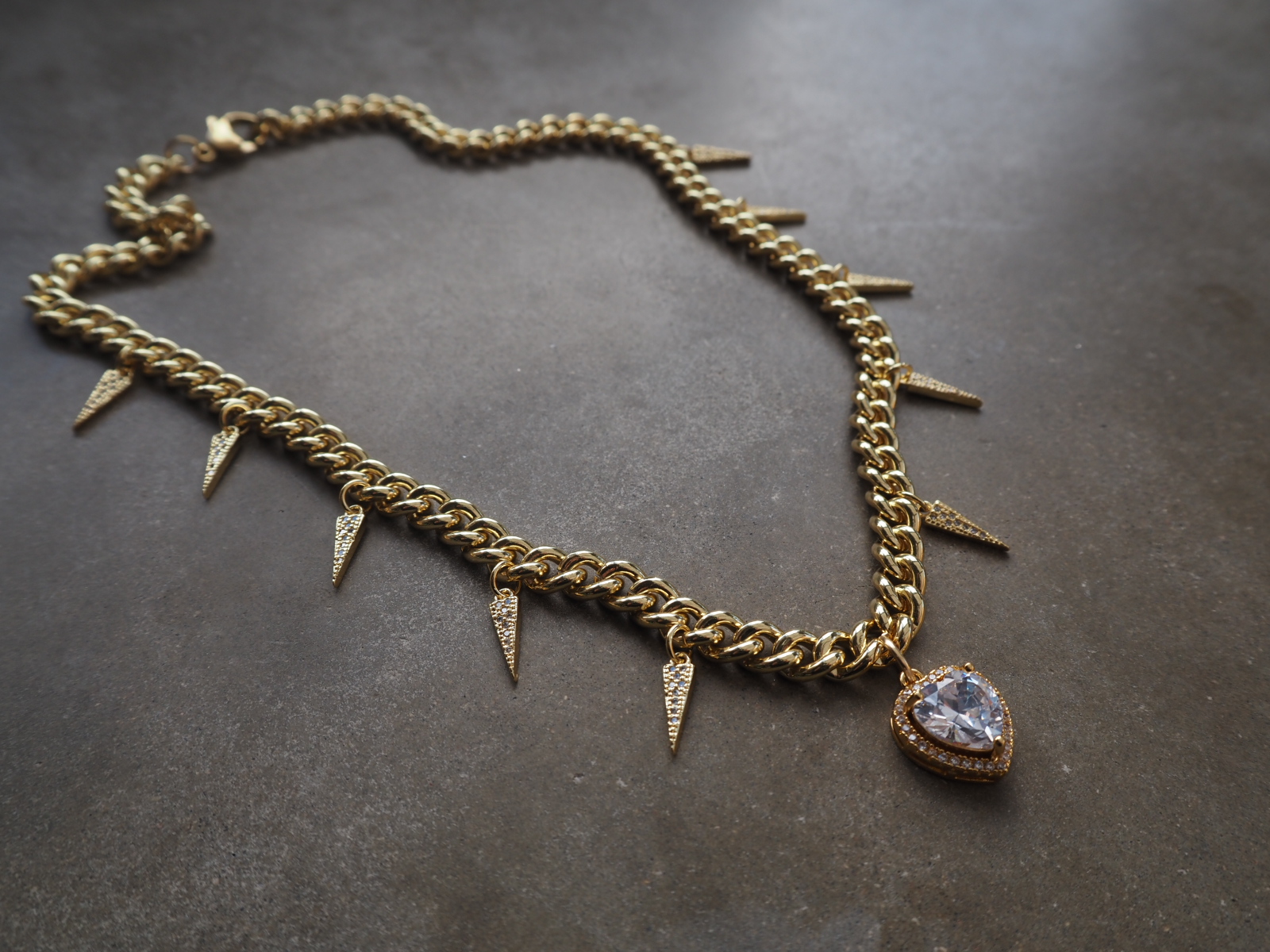 Golden Heart Necklace – guldfärgat hjärta med pärlor, spikes och hängande kedjor Material: Rostfritt stål, mässing
